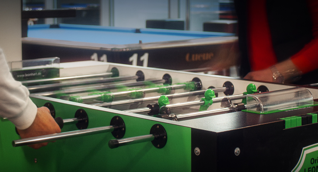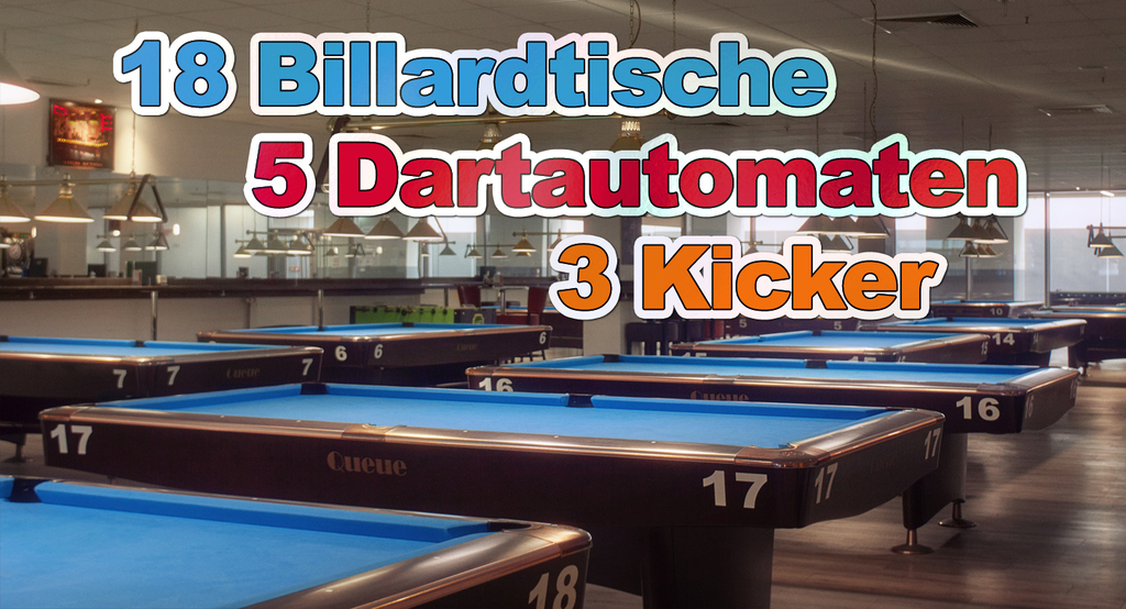 Schaut vorbei und entdeckt unser reichhaltiges Angebot an Unterhaltungsmöglichkeiten! 18 gepflegte Billardtische bieten Euch genügend Platz für spannende Partien und gesellige Runden. Daneben haben wir noch 5 E-Dart Scheiben, 2 Kickertische und einen Megakicker, an dem bis zu 24 Spieler Platz finden!