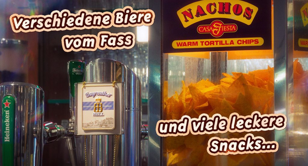 Wenn der Durst kommt, bieten wir Euch eine vielfältige Auswahl an Getränken. Von erfrischenden Softdrinks über leckere Longdrinks und Cocktails bis hin zu einer breiten Auswahl an Flaschen- und Fassbieren ist für jeden Geschmack etwas dabei. Dazu bieten wir Euch noch jede Menge leckerer Snacks, wie z.B. Knobibrot, Pizza, Nachos und Popcorn.